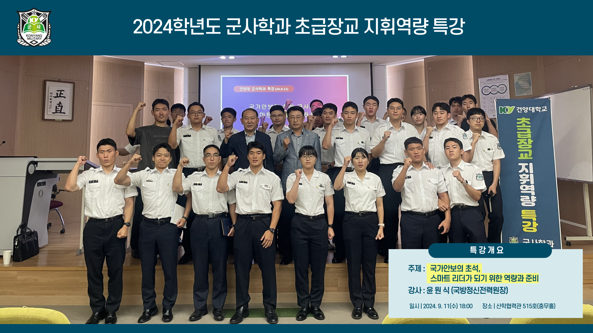 [2회차 특강] - 일자 : 2024.09.11(수) - 주제 : 국바안보의 초석, 스마트 리더가 되기 위한 역량과 준비 - 강사 : 윤 원 식 (국방정신전력원장) |