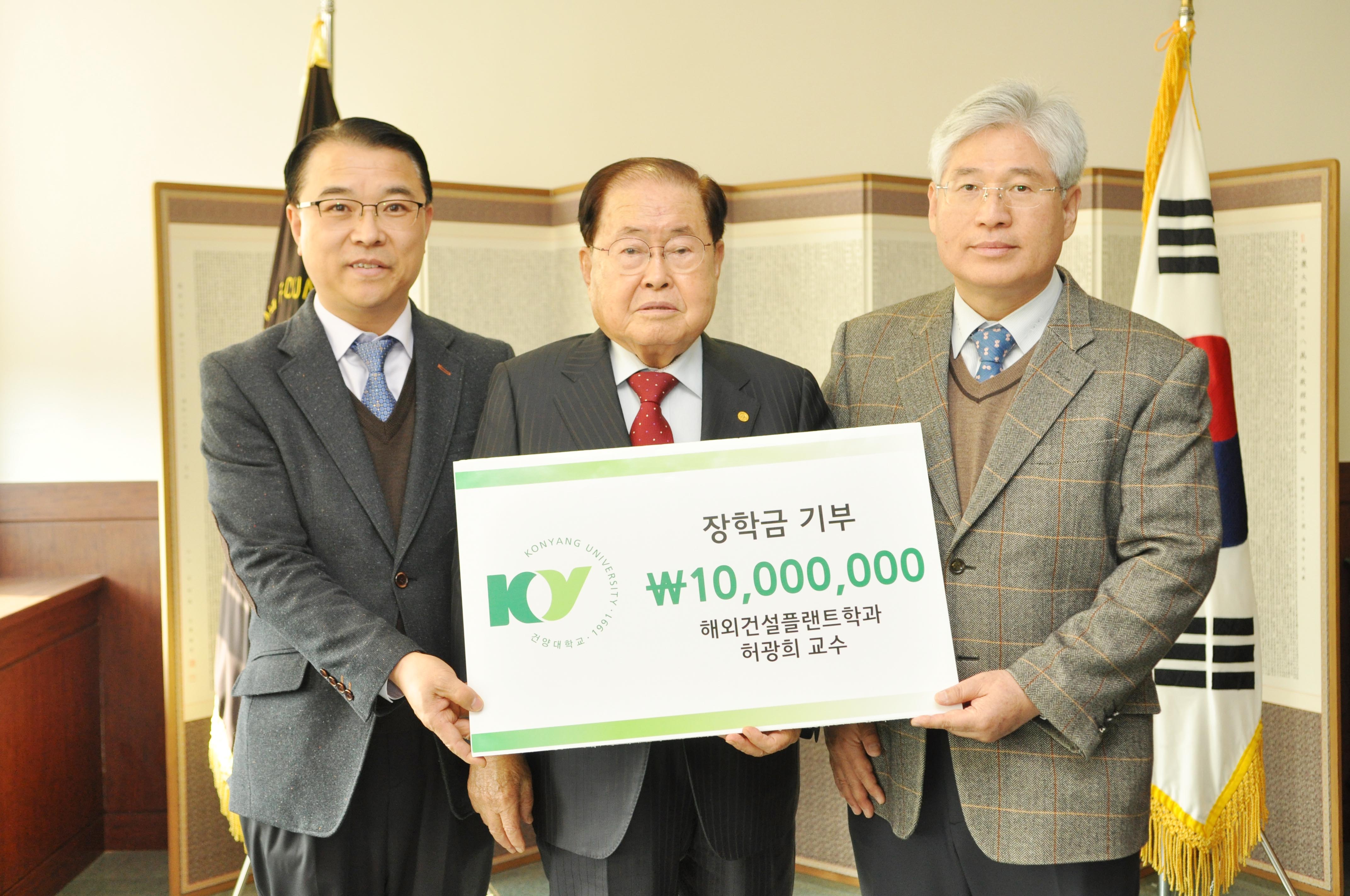 건양대 허광희 교수, 1천만원 장학금 쾌척 기술이전을 통한 수익금 중 일부 기탁해 건양대학교(총장 김희수) 해외건설플랜트학과 허광희 교수가 31일 제자들을 위해 써달라며 장학금 1,000만원을 쾌척해 쌀쌀한 연말을 훈훈케 했다. 허광희 교수는 최근 ‘건설구조물의 동적응답 획득을 위한 달팽이관 원리 기반의 무선계측시스템’을 개발해 기업에 기술이전을 하면서 발생한 수익금의 일부인 1,000만원을 어려움을 겪는 제자들을 위해 써달라며 장학기금으로 기탁했다. 이는 최근 건양대학이 산학협력사업을 집중적으로 지원한 결과로 맺어진 첫 결과이다. 허 교수는 “교수는 학생들이 있기 때문에 존재하는 것이지요. 그리고 교수는 지식을 잘 가르치는 것도 중요한 역할이지만 기회가 된다면 학생들이 경제적인 어려움 없이 공부할 수 있도록 돕는 것 또한 스승의 참 역할이라고 생각했다”며 “앞으로도 활발히 산학협력을 통하여 더 많은 기술이전을 하여 지역경제도 살리고 퇴임 전까지 학생들을 위해 넉넉한 장학기금을 조성하는 게 꿈”이라고 밝혔다. 허 교수는 99년부터 매년 빠짐없 자신의 저서 인세와 외부 특강비, 기술지도 자문비 등을 모아 제자들을 위해 장학금으로 기부해오고 있다.