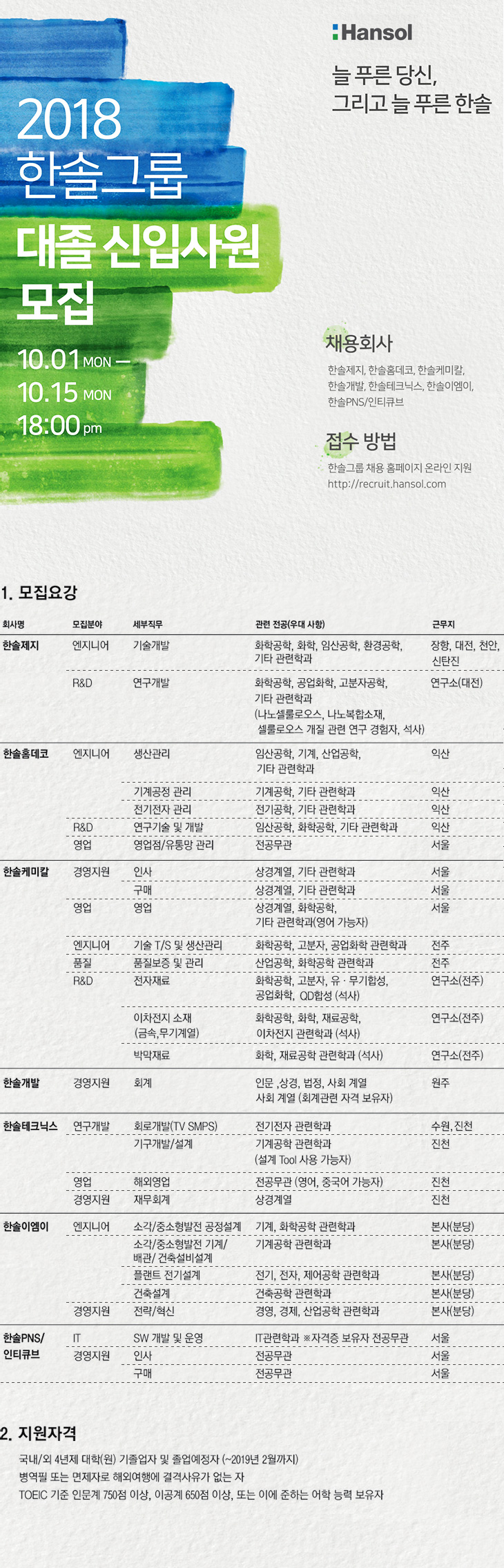 (~10/15)[한솔그룹]2018년 하반기 신입사원 공개채용 안내 글의 상세내용