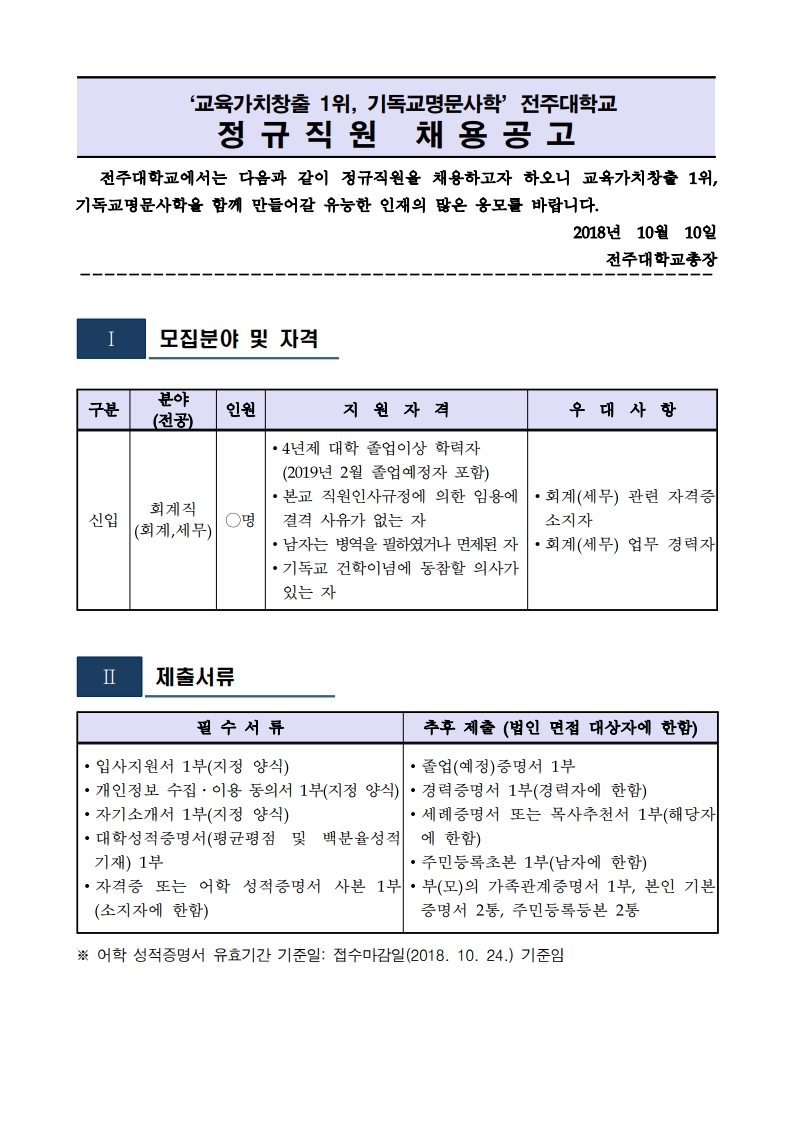 | 제목 | (~10/24)전주대학교 회계직 정규직원 채용 공고 | ||||