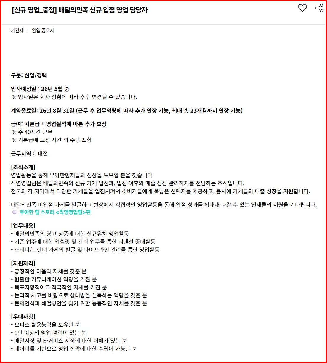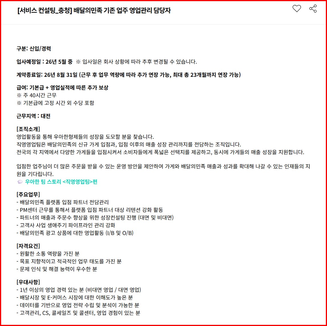 [우아한형제들]신규입점영업,영업관리,영업지원 채용 글의 상세내용
